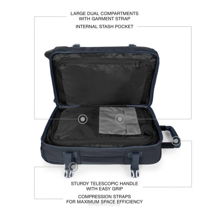 - asa telescópica, sistema de ruedas suaves y candado con código de tres dígitos tsa incorporado